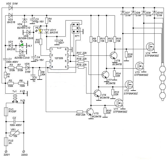 Прибор работает под управлением микроконтроллера 12F509. Этот микроконтроллер по очереди запускает импульсы тока на Если сгорит микроконтроллер, то починить устройство не получится. Потому что в новую микросхему нужно записать еще и программу, которой нет в интернете. Но обычно все проще.