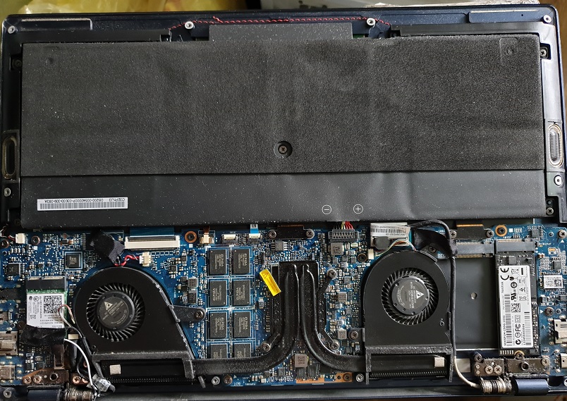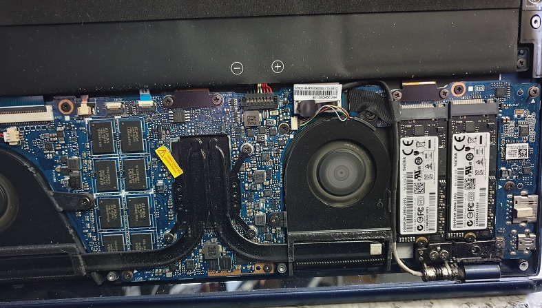 В данном ноутбуке установлено два SSD. Они подключены по схеме RAID 00, т.е. stripe. В этом случае один файл пишется сразу на два диска. Скорость записи при этом практически удваивается. Общий объем равен сумме объемов дисков.