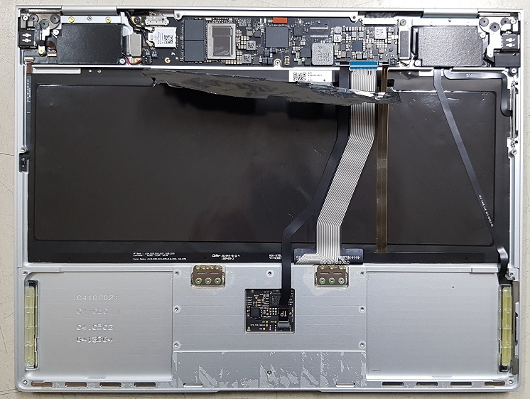 При ремонте ноутбука Google Chromebook Pixelbook самое сложное – это разборка. Потому что ноутбук склеен. Все винты нижней крышки базы заклеены пластиковой крышкой. Чтобы снять эту крышку, потребуется больше часа. На фото выше крышка без наклейки. Видны следы клея.