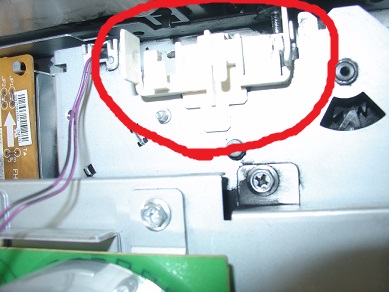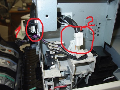 Переходим к правой стороне и отсоединяем провода датчика бумаги сиреневого цвета 1 и толстый провод нагревательного элемента печки 2. Затем выкручиваем винт скобы, которая фиксирует узел закрепления изображения, расположенной под цифрой 2, и вытаскиваем скобу на себя.