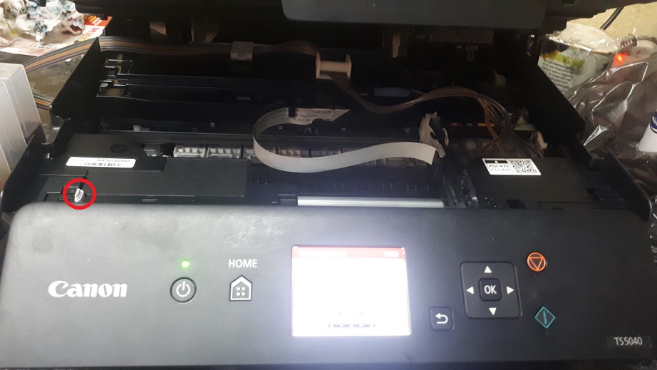 Датчик крышки сканера нужно заблокировать бумажкой (в красном кружке на фото).
