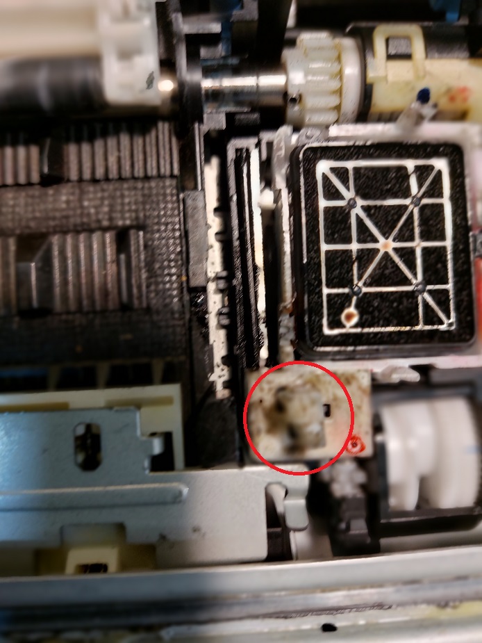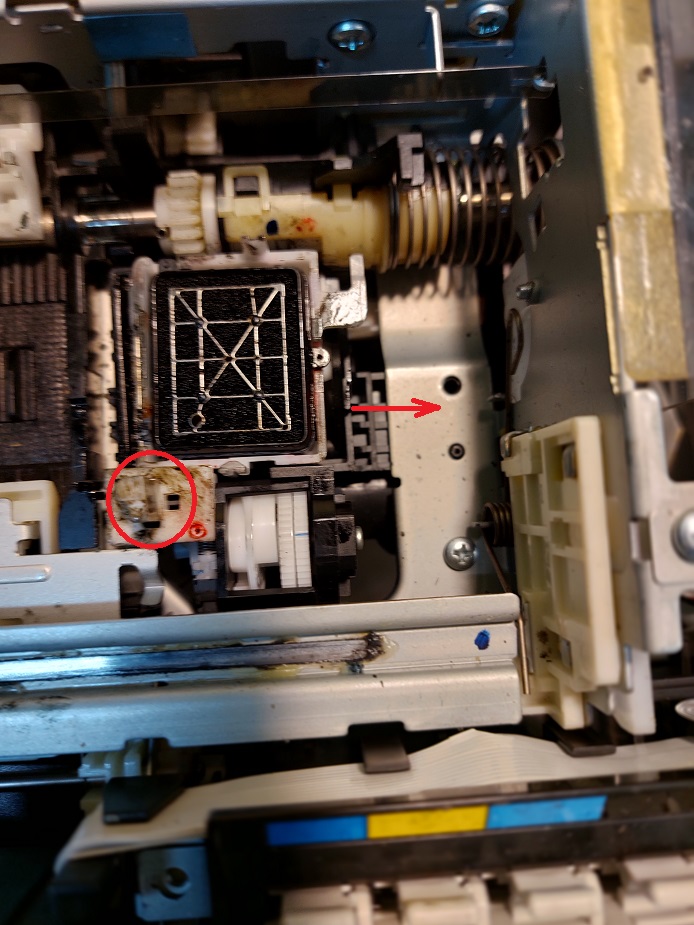 Почему в принтерах Epson TX800, TX700 не опускается стопор (в кружке на фото), не разблокируется каретка и возникает критическая ошибка принтера?