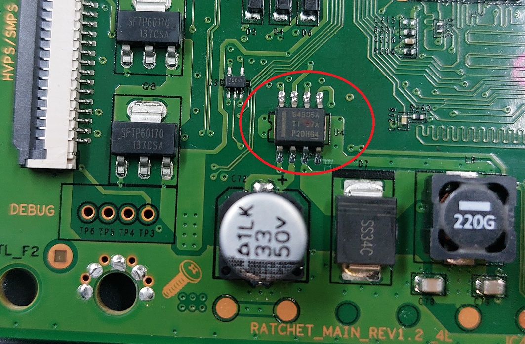 После замены предохранителя и микросхемы ШИМ контроллера TPS54335A питание на процессоре не появилось. Оказалось, что схема подключения контроллера ШИМ включает в себя обратную связь по току, которое снимается с небольшого сопротивления на входе схемы.