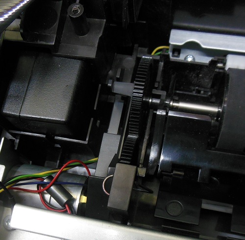 Диагностика показала: бумага доходит до датчика бумаги, который срабатывает, однако далее бумага не подается, т.к. вал подачи бумаги не крутится (основной вал вращается). Неисправность вызвана поломкой редуктора в левой половине принтера рядом с форматером.