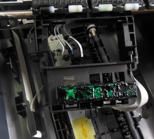 Если шлейф обгорел из-за залития, также меняем его. Ремонт шлейфа выполнить трудно из-за отсутствия запаса по длине. Но можно изготовить подобный шлейф из более широкого шлейфа. А также подобрать более длинный 4-контактный шлейф с другого принтера.