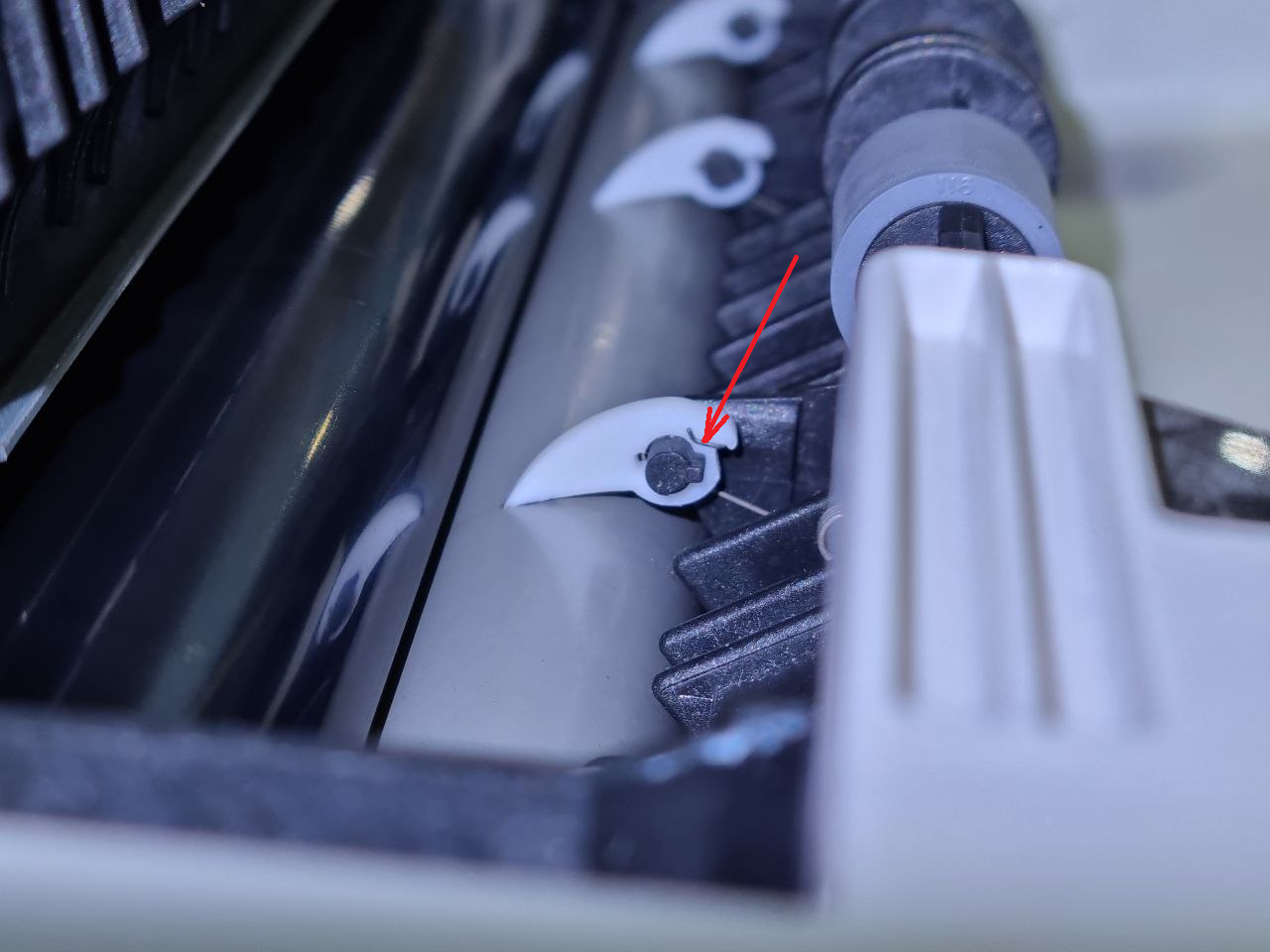 В результате диагностики выяснили, что отсутствует пружина прижима к тефлоновому валу на одном пальце. Причина неисправности заключается в том, что палец без пружинки не всегда прижимается к тефлоновому валу. При любой вибрации он отходит от поверхности вала и остается в таком положении. При печати лист упирается в этот палец отделения и не может пройти дальше в тракт подачи бумаги.